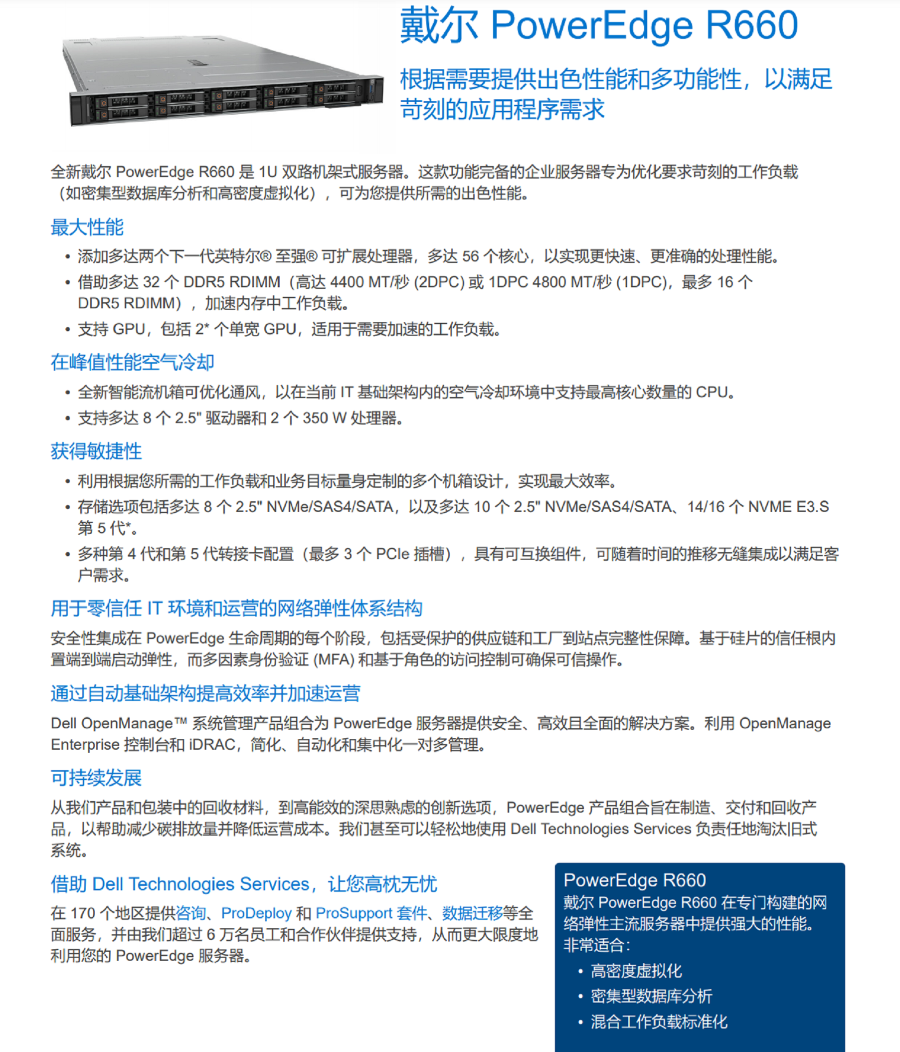 全新戴爾 PowerEdge R660 是 1U 雙路機(jī)架式服務(wù)器。這款功能完備的企業(yè)服務(wù)器專為優(yōu)化要求苛刻的工作負(fù)載(如密集型數(shù)據(jù)庫分析和高密度虛擬化),可為您提供所需的出色性能。
