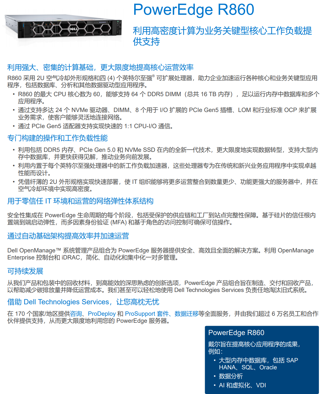 R860 采用 2U 空氣冷卻外形規(guī)格和四 (4) 個(gè)英特爾至強(qiáng)? 可擴(kuò)展處理器,助力企業(yè)加速運(yùn)行各種核心和業(yè)務(wù)關(guān)鍵型應(yīng)用程序,包括數(shù)據(jù)庫(kù)、分析和其他數(shù)據(jù)驅(qū)動(dòng)型應(yīng)用程序。